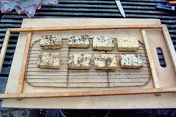 Dann ganz einfach auf dem Gitterrost im Räucherofen bei ca. 40-60 °C über Buchenspäne räuchern, bis der Käse sich leicht hellbraun färbt.