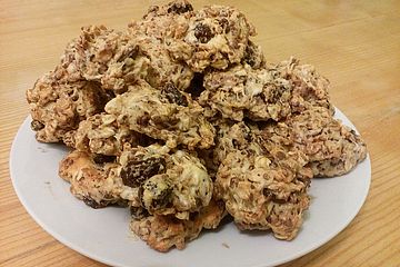 Backpapier auf einem Backblech auslegen. Nun mit zwei Löffeln kleine Häufchen des Teiges auf dem Backblech verteilen. Bei 175 Grad die Kekse 5 Min. bei Unter- und Oberhitze und 5 Min. bei Oberhitze backen. Das Backblech aus dem Ofen nehmen und die Kekse erkalten lassen.