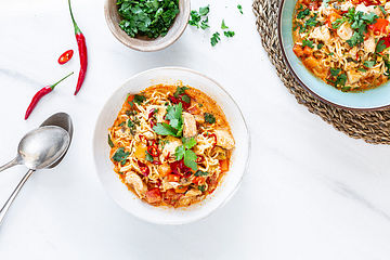 Viki röstet die Currypaste bereits zusammen mit Ingwer, Chili und etwas Speiseöl an, dadurch wird der Geschmack intensiver. Anstatt Frühlingszwiebeln könnt ihr auch Schalotten oder Zwiebeln verwenden. Sie gibt die Paprikastreifen etwas früher, als die Pilze und die Nudeln in die Suppe, damit sie schön gar werden und so besser zu verdauen sind. Viki gibt zum Verfeinern noch zwei Prisen Zucker in die Suppe. Zum Anrichten drapiert Viki zunächst ein paar Nudeln und etwas Gemüse in einen tiefen Teller, bevor sie ihn mit Suppe aufgießt. Zum Schluss garniert sie die Suppe mit frischem Koriander und etwas Minze.