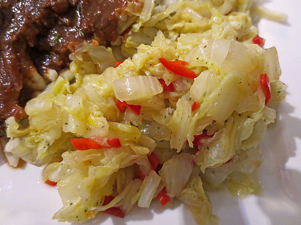 Nun die Chilischote ½ Minute anbraten, den Weißkohl dazu geben und bei mittlerer Hitze ca. 2 Minuten braten. Die Sauce dazu geben und alles bissfest garen.