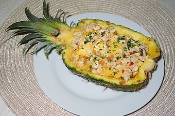 Ich habe den Salat heute gemacht und bin echt begeistert. Pfeffer, Muskat, Chutney und Ananas bilden eine sehr interessante Geschmacksmischung. 30 min Ruhezeit sind zum Quellen der Rosinen und Durchziehen eher zu knapp, wie bei den meisten Salaten ohne Blattzeugs an Besten am abend zuvor vorbereiten und in den Kühlschrank.... Beim Auslöffeln der Ananas fällt Saft an, den man unbedingt absieben muss, sonst wird der Salat eine Suppe. Ich würde keine konservierte Ananas empfehlen, da da der charakteristische Ananas-Geschmack geringer ist und zu viel austretendes Wasser und zugesetzter Zucker drin ist, dann in jedem Fall kein extra Zucker. Ich habe erst man nach Rezept gewürzt, als Pfeffer sogar den scharfen Langen Pfeffer. Es war dann ziemlich neutral, sogar vor dem Durchziehen. Ich habe dann noch deutlich mehr Pfeffer, Muskat (kommt wohl draudf an wie fein man es mahlt, im Mörser wird es nicht so fein wie Industrieprodukt) und Chutney (fast das Dpoppelte) zugesetzt, bis es optimal war. Ich hab dann noch Koriander zugesetzt. Petersilie ist zwar frei verfügbar, passt aber meiner Meinung nach nicht so zu einem exotischen Gericht. würde eher Koriandergrün nehmen oder es ganz weglassen. Man kann auch den Oberteil der Ananas mit den Blättern und den zulaufenden Oberteil als Deckel abschneiden und von oben aushöhlen, Vorteil es ist z.B. für eine Party besser transportabel und macht mehr her, aber es passt nicht der ganze Inhalt rein. Auch die Hälften haben einen Haufen drauf...