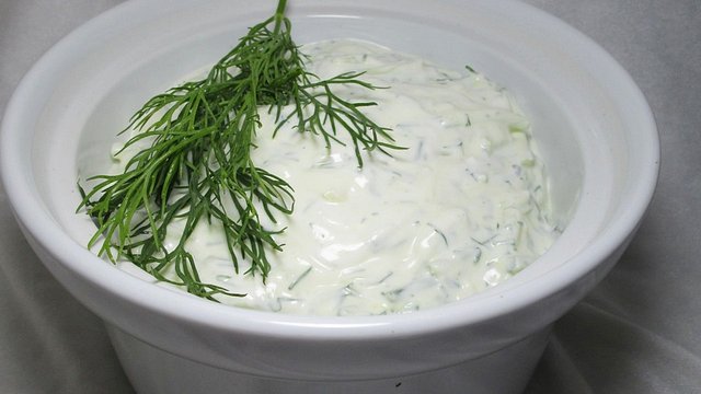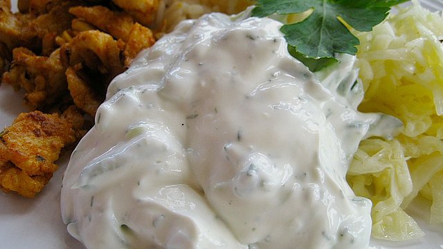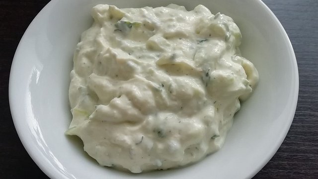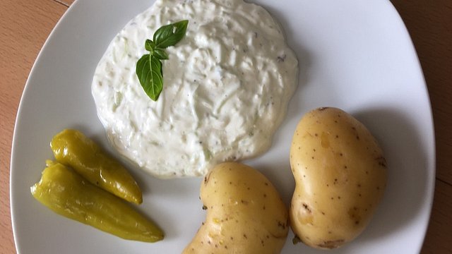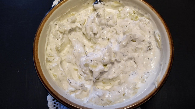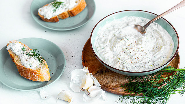 Die Gurke schälen, dann klein reiben. Gut ausdrücken und den Saft wegschütten oder anderweitig verwenden. Den griechischen Joghurt mit dem Quark und der Gurke mischen. Den Knoblauch dazupressen, je nach Geschmack kann man mehr oder weniger Knoblauchzehen nehmen. Mit Dill würzen und mit Olivenöl, Essig, Pfeffer und Salz abschmecken.