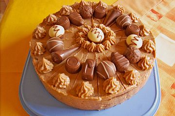 Mit der Hälfte der Creme den unteren Tortenboden bestreichen. Einen Teil der Creme in einen Spritzbeutel füllen. Den oberen Boden auflegen und mit der restlichen Creme Oberseite und Rand bestreichen. Pralinen auflegen, den Rand mit Schokoraspeln bestreuen und die Oberseite der Torte mit der Creme aus dem Spritzbeutel vollenden.