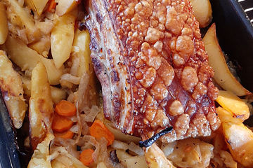 Lecker und ideal, wenn man zwar in Backofennähe ist, aber nicht viel Zeit zum Kochen hat. Der Braten macht sich beinahe von alleine. Ich lege das Fleisch immer die erste Stunde über mit der Schwarte nach unten auf die Kartoffeln, drehe es dann um und die restliche Garzeit reicht, dass die Kruste schön knusprig aber nicht "gschdärrig" (hart) wird. Das war mal ein guter Rat von unserem Metzger und hat sich bei uns so bewährt.