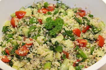Alles vermischen und mit Salz und Pfeffer abschmecken. Den Bulgur untermischen. Alles vier Stunden lang kühl stellen und ziehen lassen. Zwischendurch zweimal gut vermischen.